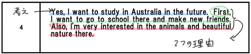 まず自分の意見を書く。その後に続いて、「First」として1つ目の理由。さらに「SecondあるいはAlso」として、2つ目の理由を加えていきます。